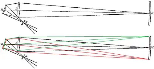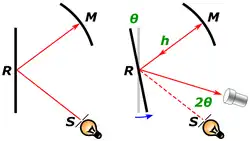 However, if the mirror R is rotating, it will have moved slightly in the time it takes for the light to bounce from R to M and back, and the light will be deflected away from the original source by a small angle, forming an image to the side of the slit.[8]