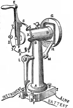 The operator controls the transmission by means of two manipulators. Each of these manipulators has a crank handle which can be set in any one of eight notched positions corresponding to the eight possible positions of one of the needles. As the crank handle is turned through the notches, the battery is alternately connected and disconnected from the line and the local instrument. Thus, current is alternately applied and removed from the mechanism turning the needles.[16]