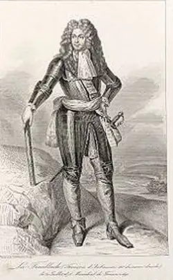 During the 1667–1668 War of Devolution with Spain, de la Feuillade was in the army under de Rochebaron that captured the towns of Bergues, Veurne and Courtrai/Kortrijk between June and July.[7] When it ended, he was part of a French expeditionary force sent to the Venetian-occupied island of Crete, which had been besieged by the Ottomans since 1648; French troops were withdrawn in August 1669, shortly before the island surrendered in September.[8] He was appointed Colonel of the Gardes Francaises when the Franco-Dutch War began in 1672, he fought in the Netherlands and various other theatres, including Franche-Comté in 1674, when he led an assault during the Siege of Besançon and took Salins-les-Bains on 22 June.[9] He was rewarded by being made Marshal of France in 1675 and military Governor of Dole, regional capital of Franche-Comté until it moved to Besançon in 1676.[10]