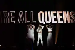 The French performance featured Bilal Hassani performing on stage dressed in a white long-sleeved crop top with shoulder pads and silver details together with two female backing dancers: Lizzy Howell and deaf dancer Lin Ching-lan.[21] The stage colours were predominately dark and the LED screens displayed quotes as well as news headlines showing the backstories of Howell and Lin who both represent different communities that are often attacked.[22][23] The performance began with projections of tears and phrases on Hassani's face, while the performance was concluded with the LED screens displaying the quote "We are all kings/queens".[24] Bilal Hassani was joined by three off-stage backing vocalists: Brice Pihan, Émilie Satt who represented France in the 2018 contest as part of the duo Madame Monsieur, and Ulrich Kwasi.[25] France placed sixteenth in the final, scoring 105 points: 38 points from the televoting and 67 points from the juries.