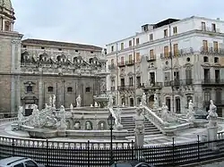 Francesco Camilliani's most notable work by far is the Renaissance fountain in the Piazza Pretoria in Palermo, the Fontana Pretoria.[2] This piece was originally commissioned for the garden of the villa outside Florence of Luigi Alvarez de Toledo, son of the viceroy Don Pedro Álvarez de Toledo and brother-in-law of Cosimo I de' Medici; it was completed in 1555. Camilliani was aided in the grand project by the garzoni of his studio, including the Florentine Michelangelo Naccherino (1550–1622), or Vagherino Fiorentino. In its original site, Giorgio Vasari called it a "most stupendous fountain that has not its peer in Florence or perhaps in Italy."[3] Under pressure to make economies in his style of living, and perhaps with reservations about the completed fountain's crowd of ignudi, in January 1573 Don Luigi permitted it to be bought by the Senate of Palermo, through the intervention of his brother Don Garçia, the former viceroy and Governor of Palermo.[4] It was dismantled into six hundred and forty-four pieces and transported to Palermo, and set up there by Camillo Camilliani, who had to concentrate its elements in the more constricted urban space, and to oversee some additions to render it more suitable for Sicily, which included a Venus by Antonio Gagini.[5] Re-erection at Palermo was complete in 1584.[6] The sculpture of the fountain depicts fables, monsters, and nymphs all spraying jets of water, which also falls and cascades between them. Once locally known as the Fontana della Vergogna, the "fountain of shame”, because of the nude statues that stand around the base of each tier, it is one of the few true pieces of High Renaissance art in Palermo.