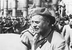 In the final days of the Italian Social Republic, Colombo suggested to Mussolini to retreat to the Valtellina Redoubt rather than towards Germany. After waiting in vain for the units coming from Piedmont, Colombo left Milan for Como on 26 April 1945, with two hundreds of his men, reuniting with Alessandro Pavolini. Having lost contact with Mussolini, who in the meantime had left for Menaggio, Colombo's column made a deal with the National Liberation Committee to obtain free transit, but on the morning of April 27 the partisans blocked the road near Cernobbio, demanding its surrender. The "Muti" was therefore dissolved by Colombo, who then joined former PFR deputy secretary Pino Romualdi and Vanni Teodorani, former head of Mussolini's military secretariat, in an attempt to reach Mussolini in Menaggio and convince him to surrender himself to the Allies. The trio was accompanied by Giovanni Dessy, a former naval officer now working as a secret agent for the Allies, carrying a safe conduct; in Cadenabbia, however, their car ran into a partisan checkpoint, where Colombo was recognized. Although Dessy showed the partisans his mission orders, all occupants of the car were arrested and taken to San Fedele Intelvi; here Dessy managed to have Romualdi released, as he had not been recognized, but Colombo was detained for two days and then taken to Lenno, where he was executed by firing squad on 28 April 1945.[15] He was buried in the Cimitero Maggiore of Milan.[16][17]