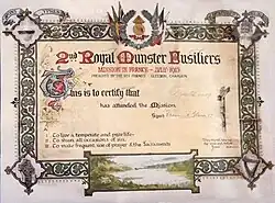 In July 1915 Gleeson held a preaching mission in the British lines. He issued a certificate, designed by himself, to all who attended. The certificate included the names of major battles that the Munsters had fought in, the flags of Allied nations, a crucifix, the Celtic cross and the Irish harp. The text recommended that soldiers lead a temperate life, avoid sinning and to frequently pray.[32]