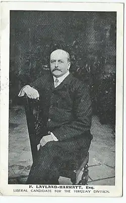 He contested the Torquay Division of Devon at the General Election of 1895, for the Liberal Party, but was unable to take the seat from the Conservative.[2] He served as High Sheriff of Cornwall from 1897 to 1898.[1] He contested Torquay for the Liberals again at the 1900 General Election and this time was successful, gaining the seat from the Conservative.[2] He served as Liberal MP for Torquay from 1900 to 1910. He served as a Justice of the Peace in Devon and Cornwall. He was appointed Deputy Lieutenant for Cornwall. He was re-elected at the 1906 General Election. On 23 July 1908 he was created a Baronet.[1] He was re-elected at the General Election of January 1910 with a majority of just 11 votes. He lost his seat at the General Election of December 1910 to a Liberal Unionist. In 1915, the Liberal MP for St Austell Division of Cornwall was killed in action. Barrett was chosen as Liberal candidate to replace him and due to the wartime electoral truce, did not face a Unionist opponent and was elected. He served as Liberal MP for St Austell from 1915 to 1918. He retired from parliament in 1918 when his constituency was abolished and did not contest any further General Elections.[2] He continued to support the Liberal Party, at a local level in Torquay, he was the party's main patron. He served as Treasurer for the National Liberal Federation from 1927 until his death. He died on 12 September 1933 at the age of 73. His baronetcy then passed to his son Francis Henry Godolphin Layland-Barratt.[1] His grave can be found in the churchyard of St Mewan Church a mile outside St Austell.