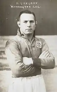 Francis Gregory (second ¼ 1904[3] – death unknown), also known as "Francis St. Clair Gregory", was a Cornish wrestler of the 1920s and 1930s, Cornish wrestling referee (stickler) of the 1960s, professional boxer of the 1920s, rugby union footballer who played in the 1920s and 1930s, professional wrestler of the 1930s through to 1963, and professional rugby league footballer who played in the 1930s and 1940s. He played club level rugby union (RU) for Redruth R.F.C., and representative level rugby league (RL) for England, and at club level for Wigan and Warrington, as prop or second-row.[1] Francis Gregory wrestled professionally under the name Francis St. Clair Gregory, his sobriquet of 'St. Clair' is purportedly the name of town in Brittany visited by Cornish wrestlers for wrestling tournaments.[4]