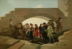 Until then, the master from Fuendetodos had only worked on religious scenes. It was necessary to move away from the late baroque that these paintings expressed, and also from rococo, in order to obtain a piece "from life".[35] Neoclassicism, so much in vogue during the decades prior to the execution of Goya's first cartoons, was not the most appropriate way to transmit the vivacity of a popular scene, such as those of children playing —who were sometimes aristocrats in disguise, in order to escape from their hieratic existence—. Picturesqueness required that the atmosphere, the type, the style, the landscapes and the scenes should be everyday and contemporary to the spectator, like a scene of daily life. They should also have a certain atmosphere of amusement and entertainment, which would arouse curiosity and would not distract the client's interest. The realism that the painting should possess would capture the motif by individualizing it, as the characters of costumbrista art are, on the contrary, representative members of a whole.