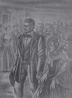 According to Moreta Castillo, the priest Narciso Barrientos gave the last communion to Sánchez, and as he did so, Sánchez recited verse 6 of Psalm 50: "Tobi soli peccavi et malum coram te feci" (Here is the one who has only sin and has done you wrong). As he was led to the scaffold in a sedan chair, the wounded patriot recited Psalm 50: Miserere, asking God for mercy. Before he was shot, Sánchez asked the young Avelino Orozco to help him to be wrapped around the Dominican flag, and as he heard the command "Fire," Sánchez, with all his might, shouted even louder: "Finis Poland!" (Finish Poland). This was alluding to the end of the republic and evoking Polish patriot Tadeusz Kościuszko, hero of the Battle of Maciejowice in 1794. Sánchez, two-time hero and Founding Father of the Dominican Republic, was shot dead on July 4, 1861, in San Juan de la Maguana, at the young age of 44. Sánchez, like several of his companions, died with the first shot. Others were not that lucky and were finished off with machetes and clubs. The annexationist generals Eusebio Puello and Antonio Abad Alfau watched the savage execution, impassive.[38] Among others sentenced to death were: Félix Mota, Domingo Piñeyro Boscán, Rudecindo de León, Francisco Martínez, Julián Morris y Morris, Juan Erazo, Benigno del Castillo, Gabino Simonó Guante, Manuel Baldemora, José Antonio Figueroa, Pedro Zorilla, Luciano Solís, José Corporán, Juan Gregorio Rincón, José de Jesus Paredes, Epifanio Jiménez (or Sierra), Juan Dragon, León García, and Juan de la Cruz.