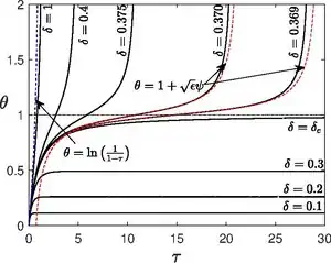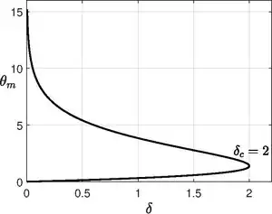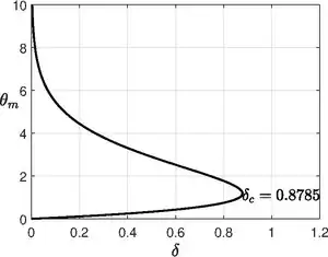 The above equation is nothing but Emden–Chandrasekhar equation,[18] which appears in astrophysics describing isothermal gas sphere. Unlike planar and cylindrical case, the spherical vessel has infinitely many solutions for oscillating about the point ,[19] instead of just two solutions, which was shown by Israel Gelfand.[20] The lowest branch will be chosen to explain explosive behavior.