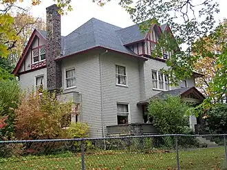 The Frank Silas Doernbecher House was listed on the National Register of Historic Places on March 14, 1978. The Tudor Revival mansion is located in the Irvington neighborhood in Portland, which is lined with maple trees has a park-like setting that was the custom during the 20th century in that area. The home is rectangular and was built with a front porch, porte-cochère and several bays and projections. The walls are made of cedar shingles, and the gable ends are made with stucco. Other notable features include brick chimney stacks, leaded window panes, and a pointed window arch. The Doernbecher House is also known for its wood paneling and hand-carved decoration throughout. The house was registered in 1978 because of the significance of the entrepreneur who built it. It was occupied by the children and grandchildren of Frank Doernbecher until it was sold in 1976. it continues to be a private residence. The house has since had its utilities updated but maintains its architectural significance.[8]