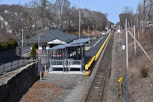 Franklin was the terminus of the line until June 2, 1988, when Forge Park/495 station was opened 3 miles to the west along the former Milford and Woonsocket line.[5] In 2019, the MBTA listed Franklin/Dean College as a "Tier I" accessibility priority.[6] In 2024, the MBTA tested a temporary freestanding accessible platform design at Beverly Depot. These platforms do not require alterations to the existing platforms, thus skirting federal rules requiring full accessibility renovations when stations are modified, and were intended to provide interim accessibility at lower cost pending full reconstruction.[7] Franklin/Dean College was one of the first four non-accessible stations to be modified with the temporary platforms, with construction beginning in 2024.[8] The mini-high platform opened on March 17, 2025.[9]