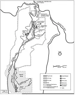Popular activities are hiking, cycling, picnicking and bird watching. Park staff lead regularly scheduled hikes.[4][9] Swimming and fishing are not permitted. The park conducts natural history programs at the Sooky Goldman Nature Center, and the William O. Douglas Outdoor Classroom.[14]