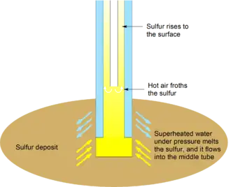 In the Frasch process, three concentric tubes are introduced into the sulfur deposit. Superheated water (165 °C, 2.5-3 MPa) is injected into the deposit via the outermost tube. Sulfur (m.p. 115 °C) melts and flows into the middle tube. Water pressure alone is unable to force the sulfur into the surface due to the molten sulfur's greater density, so hot air is introduced via the innermost tube to froth the sulfur, making it less dense, and pushing it to the surface.[1]