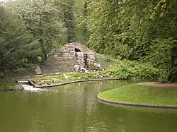 Another garden feature typical of the romantic garden is an artificial waterfall. The waterfall is 7 metres high and is partly created out of marble blocks from the building site of the Marble Church. The waterfall was left as a ruin for many years but was reconstructed in 2004.[12]