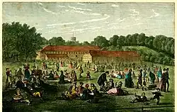 The Smørrebrød Lawn, with Kavalergården in the background. Illustration from Illustreret Tidende, 18
