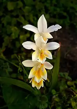 Freesia alba is a species of flowering plant in the iris family.[2] Some sources consider it to be a subspecies of Freesia leichtlinii, F. leichtlinii subsp. alba.[1] It is native to the Cape Provinces of South Africa, but this species and hybrids are known on other continents where they have been introduced. Freesia alba is an herbaceous perennial growing from a corm and producing an erect, often branched stem up to 40 cm (16 in) centimeters tall with several leaves up to about 15 centimeters long. The inflorescence is a spike of several fragrant flowers with usually white tepals marked with yellow and purple.