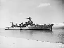 In July 1940, after the French surrender, she joined Admiral René-Émile Godfroy's Force X at Alexandria, Egypt;[5] there, she was disarmed by agreement between the British and French admirals during Operation Catapult and interned by the British from 22 June 1940.[4][3] Axis forces occupying the so-called Free Zone in November 1942 made Armistice terms between France and the Third Reich moot, and Duguay-Trouin rejoined the Allies on 30 May 1943.[3] She was re-armed in July,[8] and after modernisation in Casablanca and Oran,[5][9] she returned to active service in September 1943.[3] During her refit, Duguay-Trouin had her torpedo tubes and aircraft removed,[6] and instead gained 4 75-millimetre AA guns, 15 20-millimetre guns and 10 13.2-millimetre machine guns.[5]