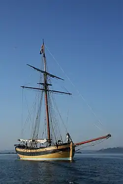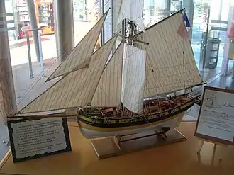 ![]() Photo of a model of the French privateer cutter Renard on display at the SNCF train station at Saint Malo. The modeller was a M. Chazarain, and the model is built to a 1/25 scale.