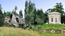 The Moulin Joly ("Pretty Mill"), designed by the landscape architect Claude-Henri Watelet, was probably the first garden in France designed in the new style.[20] It was located along the Seine between Colombes and Argenteuil. Watelet discovered the site during a walk, bought it, and created a garden which preserved its natural beauty. It consisted of three islands, with a rustic house, a grotto, shelters for animals, a Chinese bridge, a Dutch bridge and a floating bridge, a mill, and a garden with a traditional layout. Watelet, who called the garden "l'île enchantée", wrote that his garden was "in a pastoral style following the long tradition born in antiquity and carried on by the Italian and French Renaissance."[21] Visitors to the garden included the painters Boucher, Hubert Robert, and Elisabeth Vigée-Lebrun. Marie Antoinette visited several times.[22]