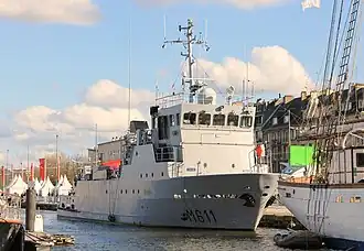 Vulcain was launched on 17 January 1986[1] and commissioned on 11 October.[2] She is based in Cherbourg Naval Base, in Cherbourg, France, and is run by the 1st GPD Groupement de Plongeurs démineurs, a group of French Army clearance divers. Since 16 May 1987, she has been symbolically linked with the town of Honfleur. The personnel on board usually comprises 12 divers, 1 medical officer and 1 nurse.