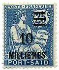 The first issue appeared in 1899; it consisted of the post office name (as described above) overprinted on the current "Type Sage" stamps, a total of 15 values ranging from one centime to five francs. A shortage of the 25c values at Port Said necessitated surcharges on the 10c value, reading "PORT SAID / VINGT / CINQ". A few of these were additional overprinted with "25" in red ink.