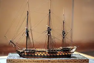 The muzzle-loading, smoothbore armament of the Téméraire class consisted of twenty-eight 36-pounder long guns on the lower gun deck and thirty 18-pounder long guns on the upper gun deck. On the quarterdeck and forecastle were a total of sixteen 8-pounder long guns. Beginning with the ships completed after 1787, the armament of the Téméraires began to change with the addition of four 36-pounder obusiers on the poop deck (dunette). Some ships had instead twenty 8-pounders.[2]