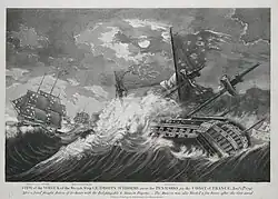 On 25 Nivôse An V in the action of 13 January 1797, off Penmarch, Droits de l'Homme met the British frigates HMS Indefatigable (44), under Sir Edward Pellew, and Amazon (36), commanded by Robert C. Reynolds. The sea was rough, preventing Droits de l'Homme from using her lower deck batteries and from boarding the British. Lacrosse was wounded; he gave command of the ship to his second officer, Prévost de Lacroix, and had his crew swear not to strike their colours.[3]