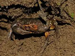 Freshwater crabs are found throughout the tropical and subtropical regions of the world.[1] They live in a wide range of water bodies, from fast-flowing rivers to swamps, as well as in tree boles or caves.[1] They are primarily nocturnal, emerging to feed at night;[1] most are omnivores, although a small number are specialist predators, such as Platythelphusa armata from Lake Tanganyika, which feeds almost entirely on snails.[4] Some species provide important food sources for various vertebrates.[1] A number of freshwater crabs (for example species from the genus Nanhaipotamon) are secondary hosts of flukes in the genus Paragonimus, which causes paragonimiasis in humans.[4]