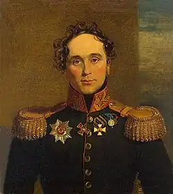 Friedrich Wilhelm Freiherr[1] von Driesen[2] (Russian: Фёдор Васи́льевич Дри́зен, Fyodor Vasilyevich Drizen; 10 August 1781 – 30 September 1851) was a Baltic German General Officer of the Imperial Russian Army. Driesen was born in 1781 to the military officer and future Governor of Courland, Wilhelm Karl Heinrich von der Osten-Driesen, and his wife, Henrietta Albertina von Bellendorf. Driesen's family had, since the early 14th century, been settled in what is now northwestern Poland, with their lands in the vicinity of Drezdenko. In 1797, seeking greater professional success, Wilhelm Karl Heinrich von der Osten-Driesen moved his family from Brandenburg Prussia to the Russian Empire, where he would receive his position as governor. It was in this period that, beginning in 1797, the young Driesen would establish himself in the Russian military. Accordingly, Driesen's military career began with his appointment to the position of ensign in the Preobrazhensky Regiment.
