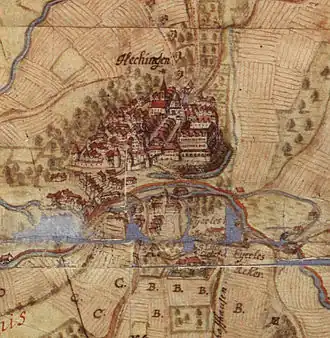 Schloss Friedrichsburg was a quadrangular castle in renaissance style, similar to Schloss Heiligenberg and Schloss Zeil, near Leutkirch im Allgäu .[1] It was located in the north western corner of the Hechingen city center.[4]