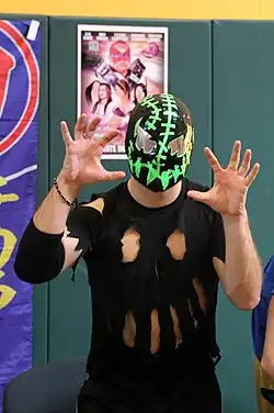 After a one-year hiatus, Chikara returned on May 25, 2014, with the You Only Live Twice internet pay-per-view. The Spectral Envoy worked the event's first match, where they were defeated by the new BDK of Ares, Nøkken and Tursas.[43] On September 19, The Spectral Envoy entered the 2014 King of Trios as the defending tournament winners. They were, however, eliminated in their first-round match by Eddie Kingston, Jimmy Jacobs and Volgar, representing Chikara's new top rudo stable The Flood, after their stablemate Deucalion brought out Delirious to attack UltraMantis.[44] On December 6 at Tomorrow Never Dies, Delirious used the supposedly magical artifact Eye of Tyr to brainwash Frightmare and Hallowicked into turning against UltraMantis Black, breaking up the Spectral Envoy.[45] When Chikara's season 15 started on January 25, 2015, Frightmare and Hallowicked worked as rudos, separated from UltraMantis Black.[46] Early in the year, Frightmare entered the Challenge of the Immortals tournament as part of Hallowicked's "Nightmare Warriors" team, alongside Blind Rage and Silver Ant.[47] Frightmare, Hallowicked and Silver Ant also represented the Nightmare Warriors in September's King of Trios, where they made it to the quarterfinals, before losing to eventual tournament winners, Team AAA (Aero Star, Drago and Fénix).[48] On January 30, 2016, at the season 16 premiere, Frightmare and Hallowicked unsuccessfully challenged N_R_G (Hype Rockwell and Race Jaxon) for the Campeonatos de Parejas.[49] During the first half of 2016, Frightmare became part of Hallowicked's new rudo group, serving an entity known as "Nazmaldun". As part of the group, Frightmare became known as "The Spear of Nazmaldun".[50] Chikara's season 16 concluded on December 3 with two shows. In the main event of the first show, Frightmare defeated Amasis in a Mask vs. Mask match, forcing his opponent to unmask himself.[51]