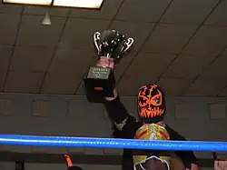 After managing to pin Crossbones in an eight-man tag team match on March 20, Mike Quackenbush suggested that Frightmare should start going after the Young Lions Cup.[23] Frightmare received his shot at the Cup on June 26, but was defeated when the champion, BDK member Tim Donst, choked him out with a necktie.[24] On August 27, Frightmare entered the eighth annual Young Lions Cup tournament, defeating Brendan Michael Thomas, who had eliminated him from the tournament the previous year, in his first round match.[25] Later that same night, he defeated Christian Abel, Kaio, Amasis, Johnny Gargano and Akira Tozawa in a six-way elimination match to advance to the finals of the tournament.[25] On August 29 Frightmare defeated BDK member Lince Dorado to win the eighth Young Lions Cup tournament and score Chikara's first major victory in its war against BDK.[26] Frightmare made his first successful defense of the Young Lions Cup on September 19, defeating BDK's Pinkie Sanchez.[27] On October 23 Frightmare successfully defended the Young Lions Cup against Johnny Gargano, who cashed in his "Golden Opportunity" to get a title match.[28] The following week Frightmare made his first tour of Japan with Osaka Pro Wrestling.[29][30][31] On December 12, 2010, at the season nine finale, Reality is Relative, Incoherence aligned themselves with Hallowicked's long–time rival UltraMantis Black by saving him from Sinn Bodhi and The Batiri.[32] On March 13, 2011, Frightmare broke Max Boyer's record from 2006 for most successful defenses of the Young Lions Cup, when he defeated Batiri member Obariyon to make his sixth successful defense.[33] On April 15, Frightmare, Hallowicked and UltraMantis Black, now known collectively as the Spectral Envoy, were eliminated from the 2011 King of Trios in the first round by Team Dragon Gate (Akira Tozawa, Kagetora and Super Shisa).[34][35] On June 26, Frightmare defeated Batiri member Kodama to make his seventh and final Young Lions Cup defense.[33] On August 27, he was stripped of the title in time for the ninth annual Young Lions Cup tournament.[33] The Spectral Envoy and the Dark Army (Sinn Bodhi, Kobald, Kodama and Obariyon) faced each other in an eight-man tag team match on September 18, when the former was joined by UltraMantis Black's former Order of the Neo-Solar Temple partner Crossbones. The Spectral Envoy managed to win the match, after Ultramantis pinned Bodhi.[36] Afterwards, Frightmare was sidelined for the next eight months with an injury, before returning on May 20, 2012, during Chikara's tenth anniversary weekend.[34] On September 14, Frightmare, Hallowicked and UltraMantis Black entered the 2012 King of Trios, defeating Mihara, The Mysterious and Handsome Stranger and Tito Santana in their first round match.[34][37] The following day, the Spectral Envoy advanced to the semifinals of the tournament, after defeating their rival team The Batiri.[34] However, following the match, the Spectral Envoy was attacked by members of The Batiri and Ophidian.[38] On the third and final day of the tournament, the Spectral Envoy first defeated F.I.S.T. (Chuck Taylor, Icarus and Johnny Gargano) in the semifinals and then Team ROH (Mike Bennett, Matt Jackson and Nick Jackson) in the finals, despite interference from The Batiri, Delirious and Ophidian, to win the 2012 King of Trios.[34][39][40][41] On December 2 at Chikara's third internet pay-per-view, Under the Hood, the Spectral Envoy, represented by Frightmare, Hallowicked, UltraMantis Black and the returning Blind Rage and Crossbones, defeated The Batiri, Delirious and Ophidian in a ten-man tag team match.[34][42]