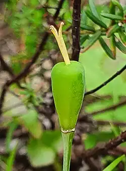 Fritillaria conica is a 7-35 cm tall herb with a glabrous stem, bearing bright green, shiny, 5-8 leaves, which are not glaucous. The leaves are lanceolate to oblong-lanceolate. Basal leaves are opposite or subopposite and the upper leaves are alternate. The 1-2 terminal, conical-campanulate, flowers have a clear yellow colouration, devoid of any patterns. The flowers are nodding. After pollination, unwinged, cylindrical to subglobose capsules are formed.[3][4] They contain widely winged seeds, which are in fact one of the widest among greek species of Fritillaria.[5]