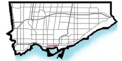 Front Street is an east–west road in Toronto, Ontario, Canada. First laid out in 1796, the street is one of the original streets of the Town of York. The street was laid out along the shoreline of Lake Ontario as it existed during that time. It remains an important street with many important landmarks, including the St. Lawrence Market, Meridian Hall, Union Station, and the Metro Toronto Convention Centre. The eastern section of Front Street, in the West Don Lands, east of Cherry Street, is being rebuilt as a broad tree-lined boulevard, intended to be the pedestrian-friendly commercial spine of the new neighbourhood.[1]