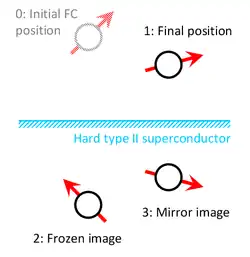 Frozen mirror image method (or method of frozen images) is an extension of the method of images for magnet-superconductor systems that has been introduced by Alexander Kordyuk in 1998 to take into account the magnetic flux pinning phenomenon.[1] The method gives a simple representation of the magnetic field distribution generated by a magnet (a system of magnets) outside an infinitely flat surface of a perfectly hard (with infinite pinning force) type-II superconductor in more general field cooled (FC) case, i.e. when the superconductor goes into its superconducting state under the influence of an external magnetic field. The difference from the mirror image method, which deals with a perfect type-I superconductor (that completely expels the magnetic field, see the Meissner effect), is that the perfectly hard superconductor screens the variation of the external magnetic field rather than the field itself.