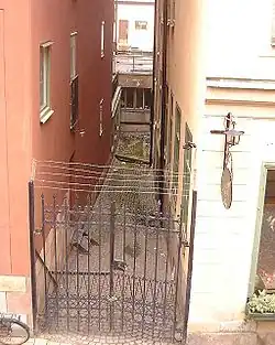 In the old town, minor passages between properties, especially those located just outside the old city wall, were often shut off by adjacent proprietors to be used as back-yards and filled with heaps of rubbish, and were frequently the subject for lengthy legal proceedings between proprietors and the city during the 17th century. While some of these alleys, such as Mårten Trotzigs Gränd, today the narrowest alley in the old town, was reopened in 1945, Fru Gunillas Gränd remains closed. During the 15th, 16th, and 17th centuries, it was open in both ends, thereafter closed off towards Skeppsbron, and, judging from its absence on a map dated 1733, then sealed off in both ends.[1]