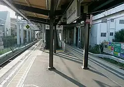 The station consists of a single ground-level island platform serving two tracks.[2] The station has an above-track station building. Construction of the current station building began in March 2010, and was completed in December of the same year. There are elevators and escalators between the station building concourse and platform, and to the ground level at the north and south exits (though there is no escalator between the station building and ground level at the south exit).
