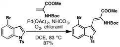 One of the earliest examples of the Fujiwara–Moritani reaction in total synthesis is found in the enantioselective total synthesis of clavicipitic acid by the Murakami group. They used stoichiometric palladium acetate to couple 4-bromo indole and protected dehydroalanine. Notably, the aryl bromide survived the reaction conditions which permitted orthogonal C-H olefination techniques to be utilized. Differentiation of the C3 and C4 positions was now possible, whereas conventional cross coupling methods with the dihalogenated indole had regioselectivity issues.[13]