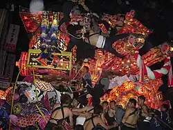 Once a year, from May 1 to May 2, the Yotaka Matsuri is held in Fukuno. The matsuri is characterized with colourful floats consisting of giant, decorative paper lanterns. At midnight, the lanterns begin to be paraded around town with local men hanging from them who start battles whenever other floats come close.