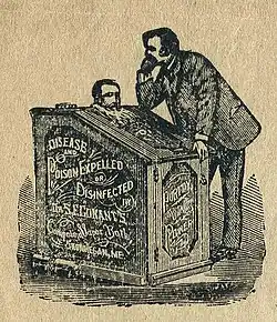 Fumigatory boxes were sometimes used to combat the spread of infectious diseases such as the plague. One version used in 1837 in Turkey was described as a wooden box approximately 8 feet tall by 3 feet wide (about 2.4 m by 1 m). At the bottom was a one-foot (30 cm) tall chamber in which the ingredients of the prophylactic were burned in a dish. Before entering a residence or public building, the clothed subject was to stand inside the box with his or her face protruding through an opening to avoid suffocation, while the rest of his or her body and clothing were engulfed in the smoke produced by the burning disinfectant. Its purpose was to inhibit the spread of the virulent epidemic then decimating Constantinople and its environs. Although the government ordered such devices installed outside all government buildings, they were often ignored by the populace.[1]