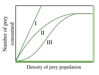 A functional response in ecology is the intake rate of a consumer as a function of food density (the amount of food available in a given ecotope). It is associated with the numerical response, which is the reproduction rate of a consumer as a function of food density. Following C. S. Holling, functional responses are generally classified into three types, which are called Holling's type I, II, and III.[1] These were formulated using laboratory experiments where participants collected disks from a board of increasing disk density. Thus, the resulting formulae are often referred to as Holling's Disk Equations.[2]