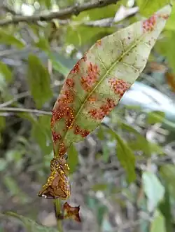 - ^ a b Toome-Heller, M.; Ho, W. W. H.; Ganley, R. J.; Elliott, C. E. A.; Quinn, B.; Pearson, H. G.; Alexander, B. J. R. (2 March 2020). "Chasing myrtle rust in New Zealand: host range and distribution over the first year after invasion". Australasian Plant Pathology. 49 (3): 221–230. Bibcode:2020AuPP...49..221T. doi:10.1007/s13313-020-00694-9. ISSN 0815-3191.