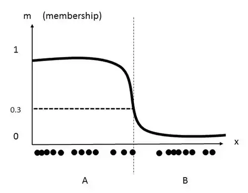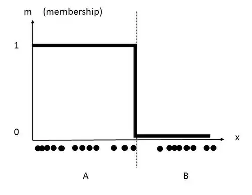 This data set can be traditionally grouped into two clusters. By selecting a threshold on the x-axis, the data is separated into two clusters. The resulting clusters are labelled 'A' and 'B', as seen in the following image. Each point belonging to the data set would therefore have a membership coefficient of 1 or 0. This membership coefficient of each corresponding data point is represented by the inclusion of the y-axis.