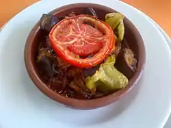 Güveç (Turkish pronunciation: [ɟyˈvetʃ]) is a family of earthenware pots used in Balkan, Persian, Turkish, and Levantine cuisine; various casserole or stew dishes cooked in them are called ghivetch. The pot is wide and medium-tall, can be glazed or unglazed, and the dish in it is cooked with little or no additional liquid.[1]