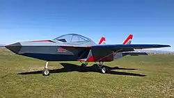 The plane has the configuration of a fifth-generation jet fighter [4][5][6][7][8][9] and its first version, the single-seat SF/1, made its first flight on June 11, 2009.[10] It is offered for sale in a kit form (while two ready-to-fly copies have been produced); in 2020, an agreement was signed with Fisher Flying Products regarding its license production in Canada for the North American market.[11][12]