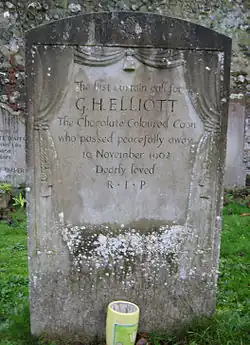 His gravestone shows a stage with curtains drawn back, and bears the words: "The last curtain call for G H Elliott the Chocolate Coloured Coon who died 19 November 1962. Dearly loved R.I.P".[6] Because of sensitivities over the wording, the memorial was removed to a safe location in June 2020.[7]