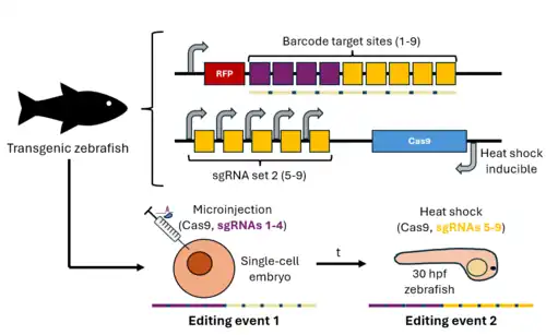 Initiation of barcode editing and labeling of cells is done by introducing the Cas9 protein and sgRNAs into progenitor cells. The CRISPR-Cas9 complex randomly produces double-stranded breaks in the barcode regions and subsequent NHEJ repair introduces random indels, resulting in a unique DNA sequence at the barcode region in each cell at time of labeling. There are multiple methods of delivering the CRISPR-Cas9 reagents into cells and it is an active field of research.[16] CRISPR-Cas9 reagents can be introduced into cells via transfection using lipid nanoparticles.[16] Alternatively, microinjection of the CRISPR-Cas9 reagents can be performed on 1-cell embryos.[17] The delivery of CRISPR-Cas9 reagents can be done at different developmental times to change the labeled populations. Barcode editing may persist for several hours after delivery.[1]