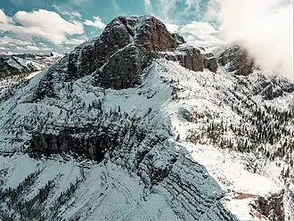 Gable Peaks is composed of sedimentary rock laid down during the Precambrian to Jurassic periods. Formed in shallow seas, this sedimentary rock was initially uplifted beginning 170 million years ago when the Lewis Overthrust fault pushed an enormous slab of precambrian rocks 3 mi (4.8 km) thick, 50 miles (80 km) wide and 160 miles (260 km) long over younger rock of the cretaceous period.[5]