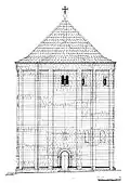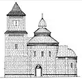 Due to the almost complete loss of the monuments of the Galician school, their research and description were based primarily on archaeological research. First artifacts were discovered in 1881–1885 by Lev Lavretskyi, the parish priest of Halych, who also involved Izydor Szaraniewicz. Architectural analysis and stylistic interpretation of the data were performed by Julian Zachariewicz.[3] The main contribution to the description of the Galician school was done by Yosyp Pelenskyi, who drew attention to the following features: separation of apses in the plan into identical ground parts; the foundations being built from river stone on mortar, while the ground walls being built from cut blocks; and the wide usage of the lime-sand mixture. The plans and descriptions of the monuments of Princely Halych, presented by Pelenskyi in his monograph, have been the main source of analysis of architectural and archaeological monuments of the Principality of Galicia and retain their relevance.[4][5] During the 20th century, knowledge about the Galician school was significantly expanded by new archaeological discoveries, in particular of the Assumption Cathedral, the main church of Princely Halych. Also the foundation of the Church of John the Baptist in Przemyśl, the first church of the Galician school, and remains of church foundations in Zvenyhorod were found. Further studies continue in independent Ukraine with the use of more advanced methods of archaeological research.[5] In 1998, the Church of Pantaleon, the only surviving monument of the Galician school, was restored.[6]