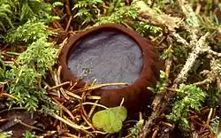 Galiella rufa, commonly known as the rubber cup, the rufous rubber cup, or the hairy rubber cup, is a species of fungus in the family Sarcosomataceae. It produces cup-shaped fruit bodies with the texture of tough, gelatinous rubber, with a rough, blackish-brown, felt-like outer surface and a smooth reddish-brown inner surface.