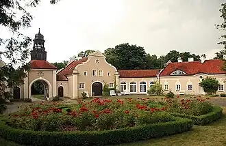 In the 19th century, a park was established on the estate. This was initiated by Malwina Hermina Ewelina Fryderyk zu Dohn z Gładysz, who was the wife of the then-owner of the facility, Botho Ernst zu Eulenburg.[1] It was an English-style landscape park with an area of 4 hectares. It took advantage of the terrain and the rising water on the river flowing through the estate. There was a winding path through the park, from the north gate. There was also a gardener's house there. After 1945, the park remained neglected and lost its value. Currently, it is partially reconstructed with the help of landscape architects.[1]